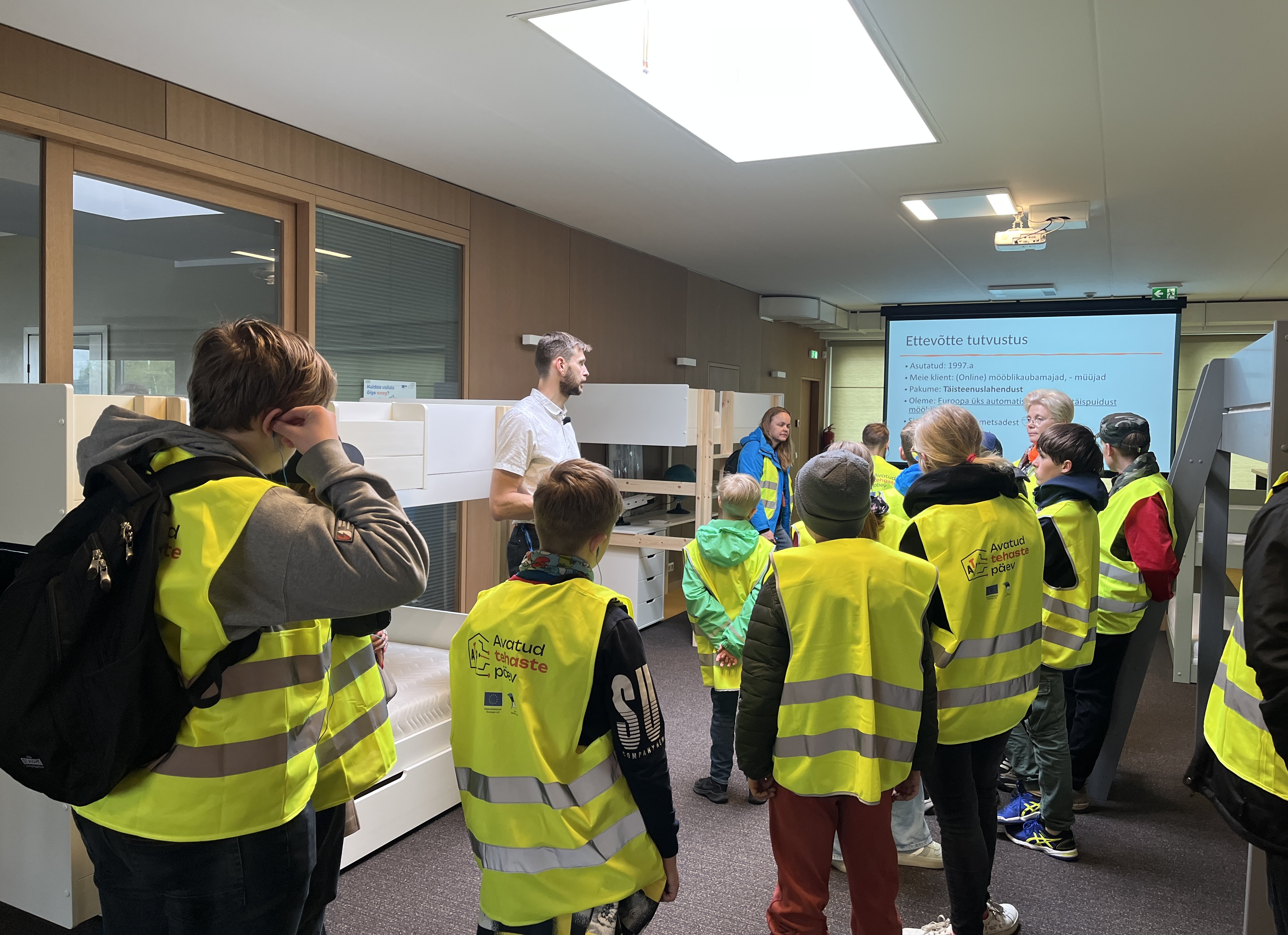 Kõigepealt astusime sisse Tiksoja Puidugruppi ja asusime ühena esimestest tegevustest riietama end turvavarustusse. Olime ju sisenemas päris tehasesse, kus tegid tööd päris robotid. Oma tuuril saime ülevaate, kuidas need tarkade inseneride poolt valmistatud masinad töötavad ja mida võivad tulevased insenerid sellest õppida. Töötavaid roboteid oli tõesti väga erinevaid ja meil oli võimalus piiluda ka tuppa, kust algas disainimine ja projekteerimine selle nimel, et robotite abiga valmiks üks äge mööblitükk.